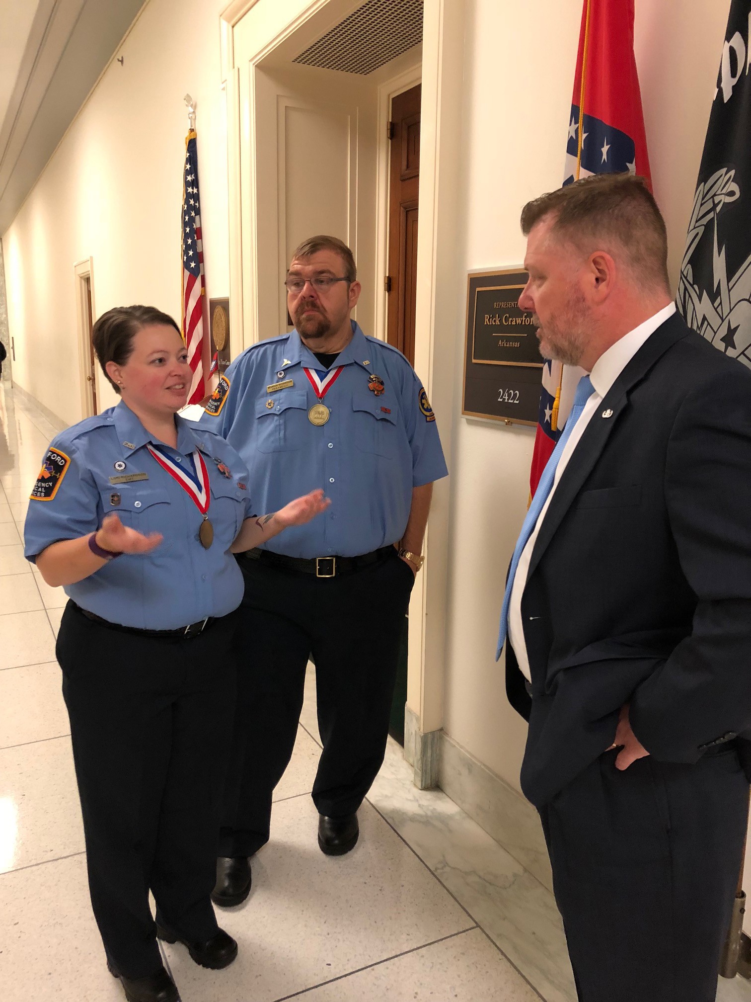 — Pafford Medical Services’ Arkansas Stars of Life, paramedic David Richardson and his partner/wife, EMT Lori Richardson of Marianna, met with Arkansas Senator Tom Cotton, Senator John Boozman, Representative Rick Crawford and Ashley Shelton from his staff, and Representative Bruce Westerman as part of the festivities surrounding the American Ambulance Association's Stars of Life program. The 100 Stars of Life for 2018 and their companies' hosts from all over the U.S. are being honored for their service to their communities. The June 12-13 meetings with the senators and representatives were also attended by Arkansas’ other Star of Life: Terry Childers (LifeNet). The senators and representatives thanked each "Star" for their service to Arkansas citizens, learned about the particular reason each one was nominated and were invited to "ride-along" with any of the services represented when they are back in their respective Arkansas districts to witness first hand the critical role played by the state's EMS providers. During the meeting, the Richardsons were congratulated for going the extra mile to provide comfort during and after calls to their fellow citizens, most of whom they know. They were also lauded for showing a commitment to EMS that spills over from the work schedule into their everyday lives. “We’re so proud of David and Lori and delighted that their exemplary service is being honored on such a grand stage,” said Jamie Pafford-Gresham, CEO of Pafford Medical Services and chairperson for the American Ambulance Association’s Government Affairs Committee. She accompanied the Richardsons to the meeting, along with Rebecca Williamson, chief compliance officer for Pafford Medical Services and chairperson for the American Ambulance Association's Medicare Regulatory Committee.